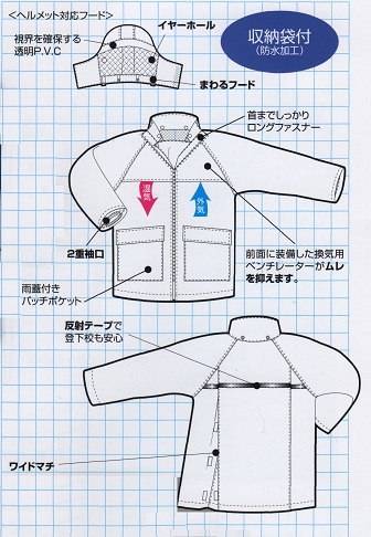 | 1 交通事故防止の目立つオレンジ色 2 ストロング素材使用だから丈夫 3 カバンを背負ったまま着用可能 4 回るフードで視界良好 |